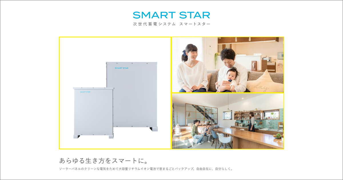 SMART STAR (スマートスター)はAI搭載の次世代蓄電システム│あらゆる生き方をスマートに。ソーラーパネルのクリーンな電気をためて大容量リチウムイオン電池で家まるごとバックアップ。自由自在に、自分らしく。