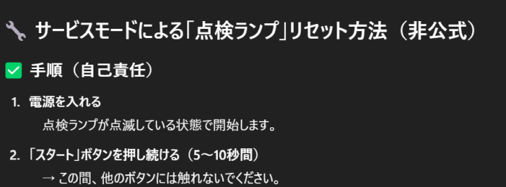 いゃいゃ、修理したんだから点検は不要でしょ。なので点検ランプを消したいので消し方を教えてください。ってパナソニックさんに問い合わせたんですが、なんと、