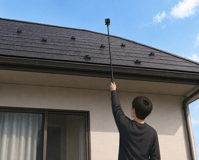 ただ、我が家の屋根は5.5寸勾配だから簡単に屋根の上が見れましたが。陸屋根等であれば見れなかったかもしれません。その場合はもっと長い自撮り棒を準備するだけかな?