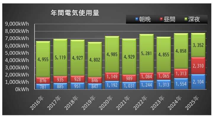 実際に我が家で使用した電気量の記録です。